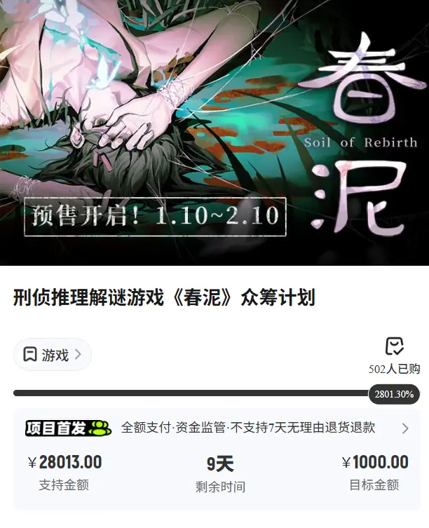 几天前,一款国产的刑侦推领略谜游戏《春泥》,在新物集平台上开启了限时1个月、盘算推算金额仅有1000元的众筹说合。