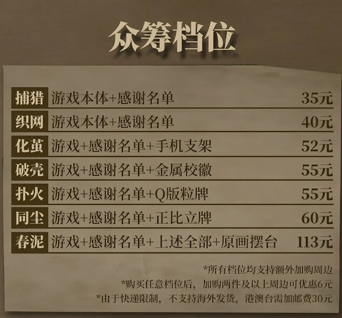 不外,倘若仔细看一下它的众筹内容:从基础款的游戏实践Key+感谢名单到顶配的追加附进大礼包的不同档位,价钱则在35-113元不等。