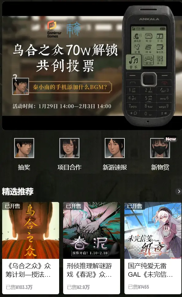 有兴味的是,比年来这种宣传本领,愈发成为了一种众筹平台与游戏之间的双赢之举。像是《春泥》以及《乌合之众》齐在“新物集”这个APP上进行众筹。