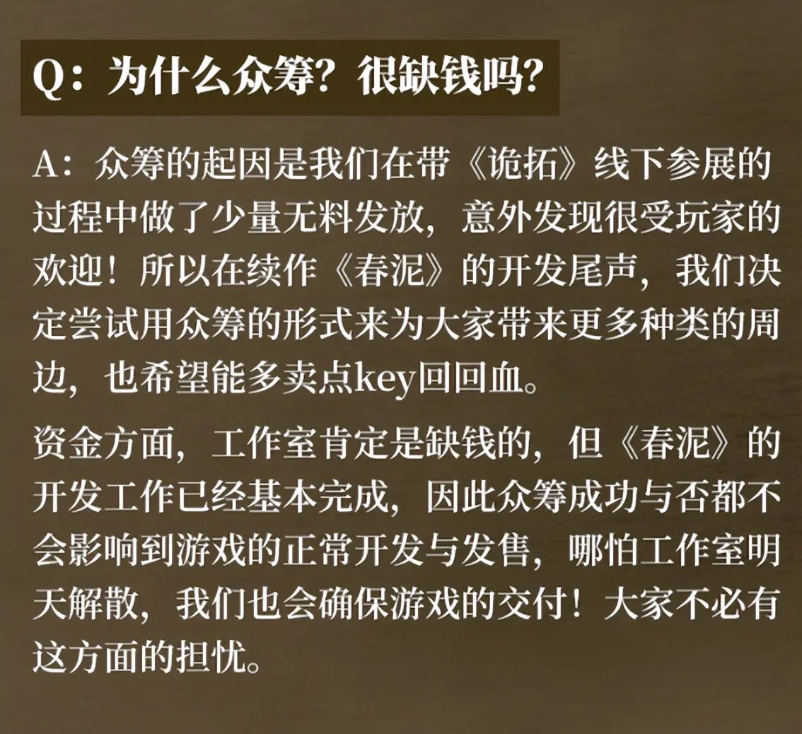 是以,游戏众筹,草率是变味了,但也不全然是坏处。至少,它也变成了一种能让制作组和中枢粉丝与社群更即时、灵验交流的神情。