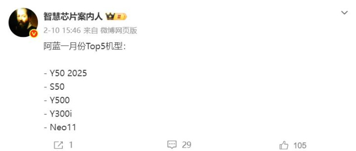 vivo一月份热销机型前五差别是:vivo Y50 2025款,vivo S50、vivo Y500、vivo Y300i、iQOO Neo11。从vivo的单品热销榜来看,当下的vivo所以中低端产物为基本盘的,其中Y系列是vivo的复旧产物线,前五之中独占三款。缺憾的是vivo的热销机型中莫得旗舰上榜,看来在线下旗舰的销量确切未几。因为vivo的Y系列基本上王人所以线下销量为主的,许多机型官方王人弗成就布会,亚博app平直就开卖了。