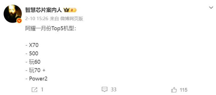 荣耀1月份的热销机型差别是:荣耀X70、荣耀500、荣耀畅玩60、荣耀畅玩70+、荣耀Power2。荣耀的情况与vivo、OPPO基本上相似,也所以中低端机型为基本盘的。其中荣耀X70这款机型在同档中可以用封神来神志,合座销量是无敌相似的存在。其中在一月份累计销量就最初100万台,是国产第二个能在1月份累计销量破百万的机型。