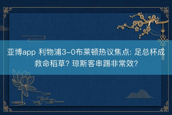 亚博app 利物浦3-0布莱顿热议焦点: 足总杯成救命稻草? 琼斯客串踢非常效?利物浦踢出了几分昔日风范,以 3-0 粗略打败布莱顿,挺进足总杯第五轮。斯洛特的一次经心想象的冒险取得了奏凯,但这一决定曩昔卤莽会让他自食苦果。 以下是本场比赛几大热议焦点: 【穆罕默德・萨拉赫与利物浦依旧威力统统】 在场上看到利物浦畅通传控、平缓自信地发起焦炙,既让东谈主咫尺一亮,又倍感省心。 本场比赛的锋线中枢依旧是穆罕默德