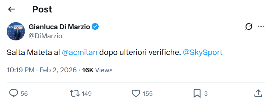 虎扑02月02日讯 意大利有名转会巨匠迪马济奥音信,历程进一步搜检,亚搏AC米兰铲除引进马特塔。