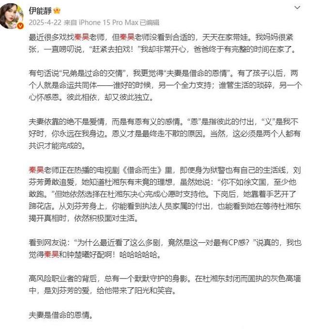 伊能静莫得躲。她在一次直播里径直启齿流露,从没说过那些极点的话。所谓不谈百年偕老,仅仅念念教唆我方多惊奇目下东谈主,好好过每一天。网友截了她一句秦昊很少回家的话,又开动新一轮解读。她干脆把秦昊责任室的法院公告转发出去,解释他拍戏终年在外奔走,并不是不顾家。这么的举动,让东谈主看到她护家的那股干劲。