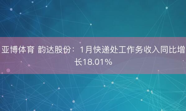 亚博体育 韵达股份:1月快递处工作务收入同比增长18.01%{jz:field.toptypename/} 东谈主民财讯2月13日电,韵达股份(002120)2月13日公告,2026年1月快递处工作务收入48.02亿元,同比增长18.01%;完成业务量22.31亿票,同比增长10.83%;快递处事单票收入2.15元,同比增长6.44%。 发布于:广东省