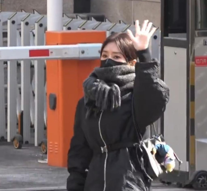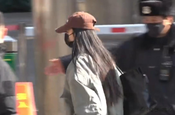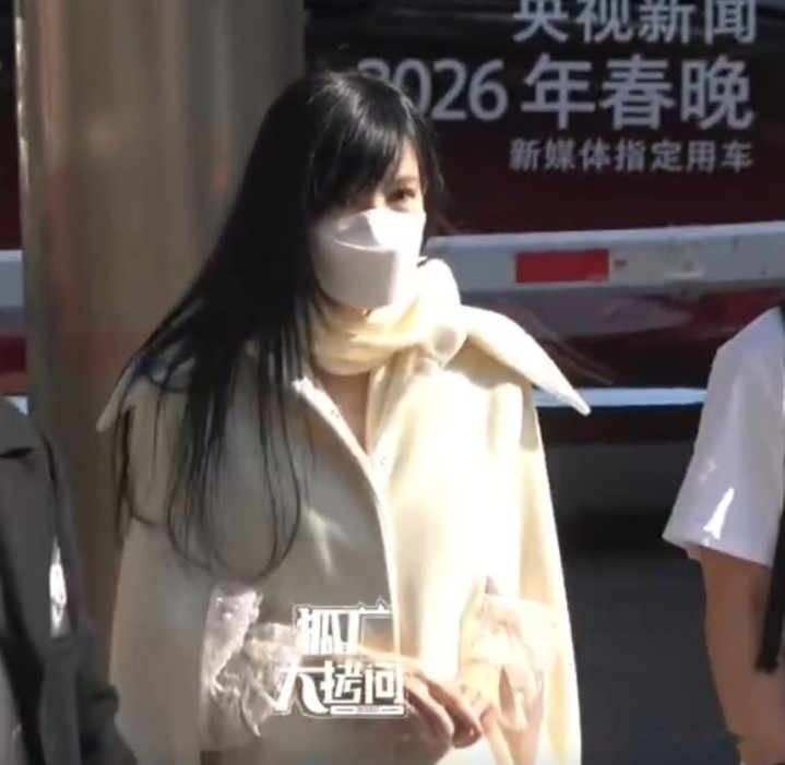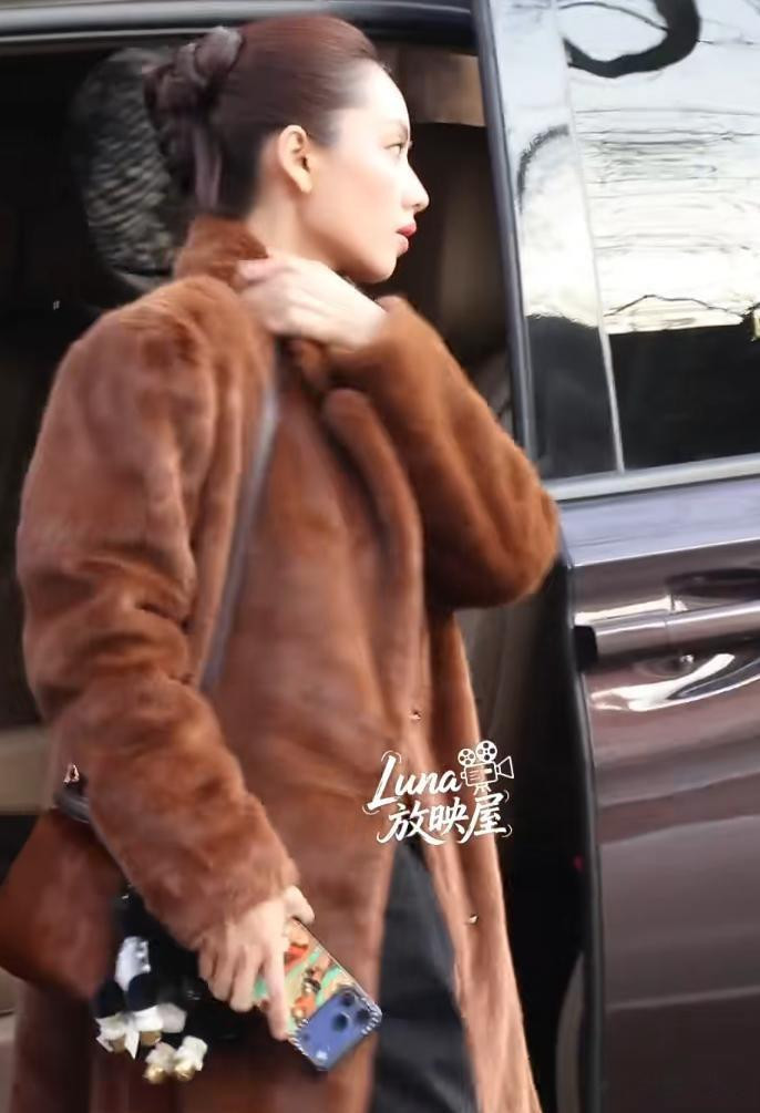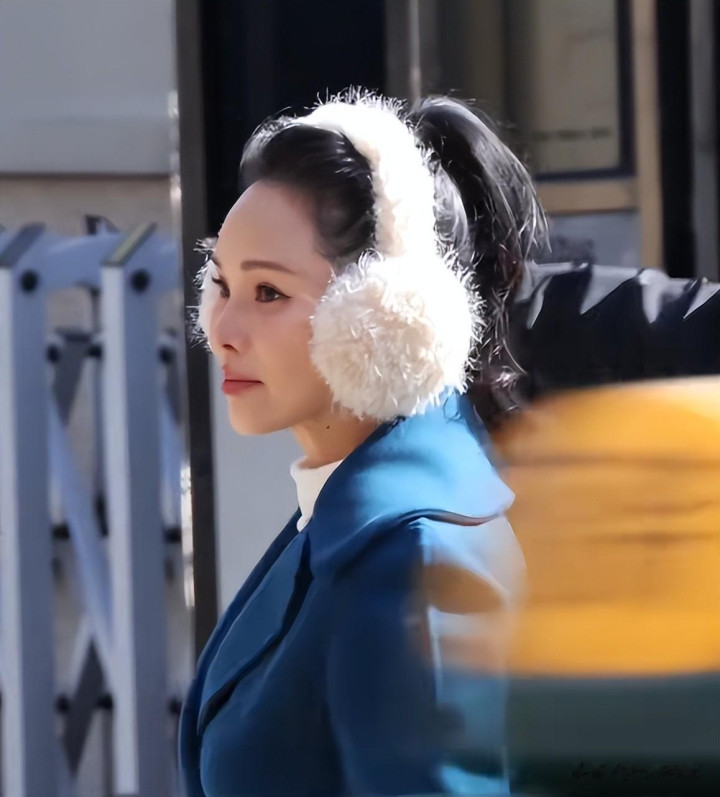 伊能静扎着高马尾,戴着两只毛茸茸的“小耳朵”走来,这是她在本年彩排上班路上第一次被拍到。